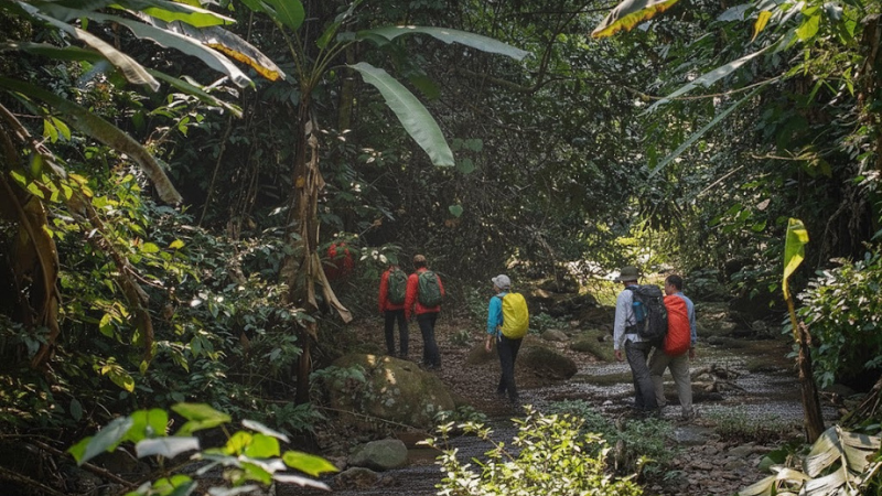 - Trek xuyên rừng, tay cầm gậy, chân dẫm lá khô, cảm giác như thám hiểm xưa